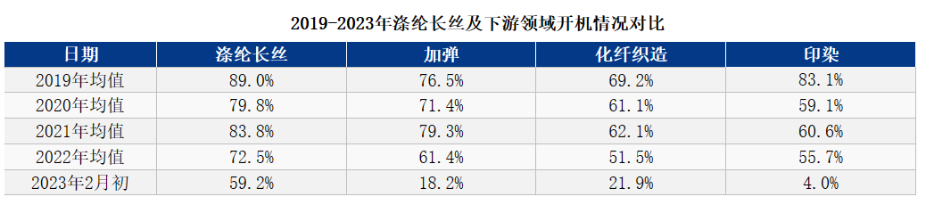 織造開機(jī)率提升,滌絲產(chǎn)銷難見增長!按照往年慣例,正月十五前后下游織造行業(yè)開機(jī)率逐漸提升至3-5成,2月底3月初開機(jī)率提升至6-7成,而今年織造開機(jī)率提升緩慢,目前化纖織造開機(jī)率僅2成附近,而滌綸長絲產(chǎn)能利用率已上升至59.2%。
