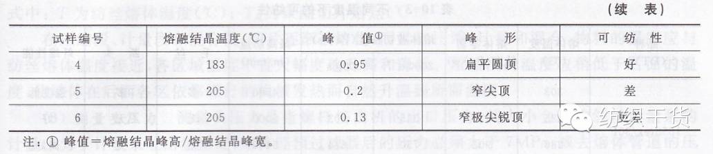 (10)熔融結(jié)晶峰。聚酯切片的紡絲過程,實(shí)際上是聚酯熔融到冷卻成形所發(fā)生的一切變化。聚酯的結(jié)晶能力不僅影響纖維的結(jié)晶度和取向度,進(jìn)而影響纖維的性質(zhì),而且受紡絲條件的影響。聚酯切片在DSC曲線上的熔融結(jié)晶溫度及熔融結(jié)晶峰高在很大程度上反映了聚酯的結(jié)晶能力。6種不同樣品的熱分析結(jié)果見表10-2。