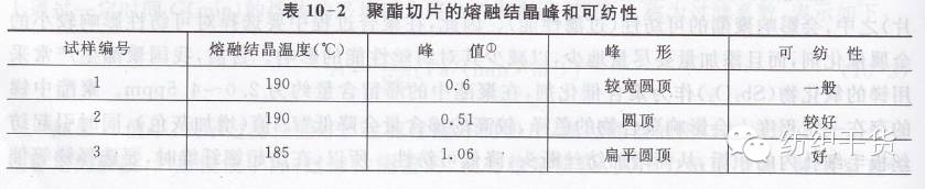 由上表可知,聚酯切片的可紡性與它的熔融結(jié)晶溫度及熔融結(jié)晶峰形有很大關(guān)系。熔融結(jié)晶溫度較低且峰形分布寬而平坦的聚酯切片,可紡性較好;相反,熔融結(jié)晶溫度較高、峰形分布極尖銳的聚酯切片,可紡性較差。一般熔融結(jié)晶溫度為170~180℃的聚酯切片,可紡性良好。若用峰值來表征切片的可紡性,其值為0.5~1.0的聚酯切片的可紡性較好,低于0.5的切片的可紡性就差。結(jié)晶速度過快的聚酯熔體出噴絲頭就迅速生成結(jié)晶結(jié)構(gòu),使大分子的平行取向發(fā)生困難,導(dǎo)致其纖維質(zhì)量不佳;而且在后拉伸變形過程中必須在較高溫度下進(jìn)行拉伸和變形,使拉伸變形加工難度增加;當(dāng)纖維進(jìn)一步熱定型時(shí),由于結(jié)晶速度過快,往往會生成大結(jié)晶塊,結(jié)晶結(jié)構(gòu)均勻性差。所有這些因素都會造成制得最終成品的品質(zhì)不良。所以,希望聚酯有較低的熔融結(jié)晶溫度和較慢的結(jié)晶速度。