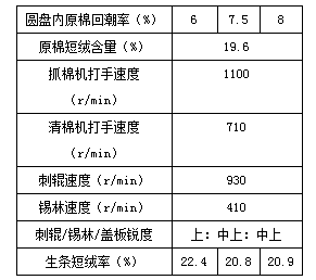 我公司使用的是新疆棉及進口棉,回潮較低(一般在6%以下),難以滿足清棉工序的生產(chǎn)工藝要求,短絨增加較多,因此在生產(chǎn)前要對原棉進行必要的預松包加濕處理,使原棉回潮率提高到7.0%以上,以利于提高纖維強力,減少纖維在打擊分梳過程中的斷裂,生產(chǎn)實踐表明(見表1),原棉回潮率過低,生條短絨增加較多,當原棉回潮率達到7.5%以上時,生條短絨的增長基本趨于穩(wěn)定。因此清棉相對濕度一般要控制在60~65%、梳棉控制在50~55%,以使纖維在生產(chǎn)過程中處于外干內(nèi)濕的放濕狀態(tài),增強纖維的柔軟性和抗打擊能力。清棉工序原棉的回潮率過小,棉纖維脆弱易被打斷,落棉增加,而短絨增加會直接影響成紗強力。若回潮率過大則不利于開松除雜,纖維易產(chǎn)生束絲。梳棉如相對濕度偏高,則會產(chǎn)生分梳困難、棉結(jié)增加、除雜效率下降、斷頭增多,如果相對濕度太低,則纖維易脆斷、落棉飛花增多。生條回潮率一般控制在(6.5土0.5)%為宜。