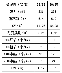 細紗車間的相對濕度要比并粗小一些,以使粗紗在細紗車間保持內(nèi)濕外干的放濕狀態(tài),這樣纖維柔而不易粘附,易加工、導電性好、摩擦力小,對牽伸有利。車間溫濕度的控制與棉纖維的線密度也有關(guān),細纖維比粗纖維的柔軟性要好,且中空度較高,易吸濕,生產(chǎn)細纖維應比生產(chǎn)粗纖維濕度低一些。如果相對濕度過大,紗線與鋼絲圈之間以及鋼絲圈與綱領(lǐng)之間的摩擦力增大,易造成鋼絲圈飛圈,羅拉、皮圈表面附著飛花,皮輥發(fā)粘,繞皮輥,出硬頭等,影響生產(chǎn)。所以要求相對濕度偏小控制,但不宜太小,相對濕度過小易使棉纖維散失,飛花增多,牽伸過程中易產(chǎn)生靜電,纏繞皮輥,成紗毛羽增加,強力下降。細紗一般相對濕度不宜超過60%,回潮率在6.5-7.0%之間,精梳40支純棉紗在不同溫濕度狀況下主要指標見表3。